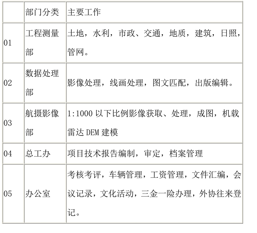 目前測(cè)量分公司和總公司的關(guān)系基本明確。定位為生產(chǎn)單位。分兩步走完成改制。第一步帳務(wù)獨(dú)立,財(cái)務(wù)獨(dú)立,管理獨(dú)立。這個(gè)要求目前基本解決。第二步生產(chǎn)單位人員雙重身份的確定(既是生產(chǎn)者也是股東)?! ∫J(rèn)真研究當(dāng)前公司所面臨的發(fā)展機(jī)遇和行業(yè)動(dòng)態(tài),掌握工程測(cè)繪未來(lái)的發(fā)展方向,瞄準(zhǔn)市場(chǎng)的增長(zhǎng)點(diǎn),及時(shí)調(diào)整人員結(jié)構(gòu),做好重點(diǎn)任務(wù)的落實(shí)工作。 1.6重點(diǎn)任務(wù)